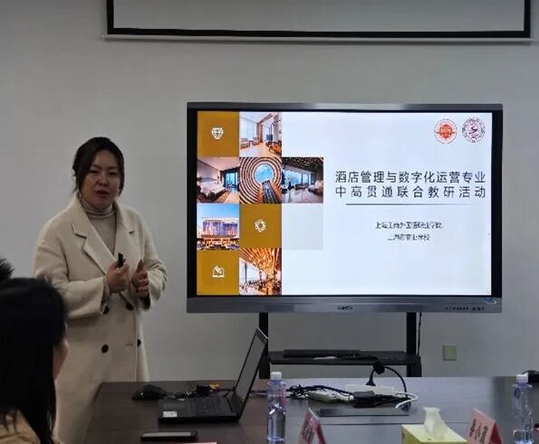 2025年12月4日下午1:40,上海工商外国语职业学院和上海市商业学校举行25级酒店管理与数字化运营中高贯通班专业早期认知教育及联合教研活动。出席本次活动的有上海市商业学校副校长金南辉、现代服务教学部党支部书记鲁小蕴、酒店专业负责人黄敏、酒店专业251班主任刘宏,以及上海工商外国语职业学院商学院副院长兼酒店专业主任于丽艳、学工办主任严丹芬、教管办副主任闫光超、酒店专业骨干教师位倩,以及30名25级酒店管理与数字化运营中高贯通班全体学生。
