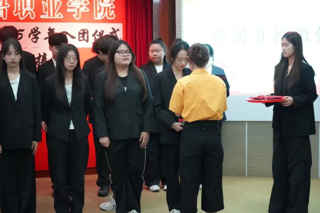 随后,由严丹芬老师宣读新团员名单,并由老师代表为新团员颁发团员证和佩戴团徽。在鲜红的团旗下,团员身份的象征被郑重授予,每一位新团员眼中都闪烁着自豪与坚定。