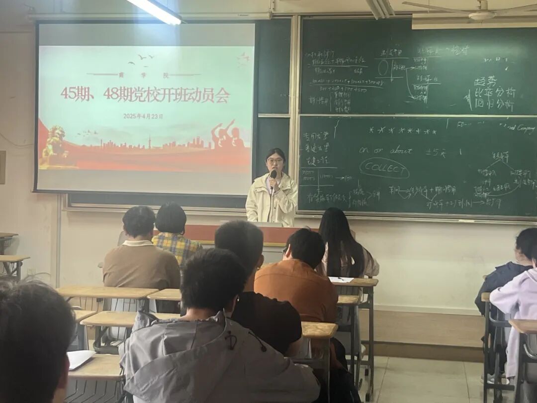 为加强入党积极分子的思想政治教育,提升党性修养,提高学生思想道德修养,筑牢思想根基。2025年4月23日商学院在80419召开党校第48期中级班和第45期高级班开班动员大会。出席本次动员大会的有商学院党校联络人薛琪其老师以及66名党校学员。